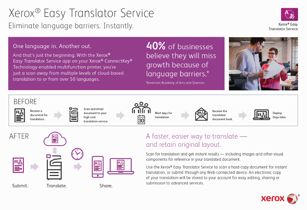 Acest serviciu oferă posibilități extraordinare: utilizatorii imprimantelor multifuncționale pot scana un document și pot primi imediat traducerea imprimată și/sau o notificare prin e-mail cu link pentru descărcarea documentului tradus (în peste 40 de limbi) în format Microsoft Word “.doc”. Documentele sau imaginile pot fi trimise acestui serviciu și de pe un PC ori de pe un dipozitiv mobil cu iOS sau Android. Xerox a instalat prima aplicaţie Xerox Easy Translator din România la partenerul UBB FSEGA, unde avem parte de rezultate excepţionale. Vezi studiul de caz.